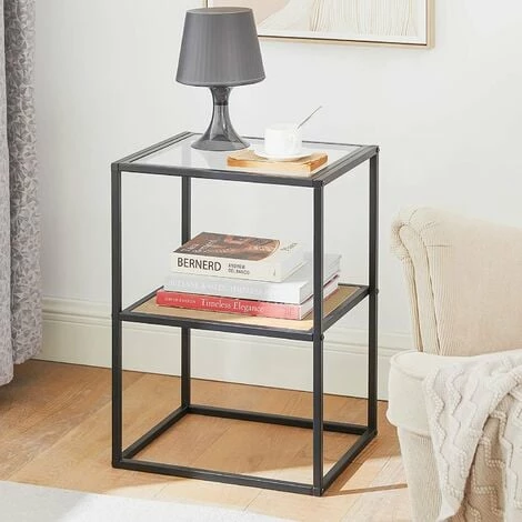 Made of high quality tempered glass, MDF with wooden effect and black powder coated steel frame.