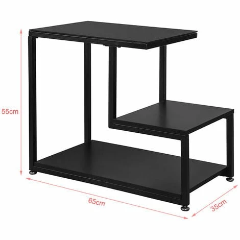 Black powder coated steel frame, particle board shelves and tempered glass top, sturdy & durable.