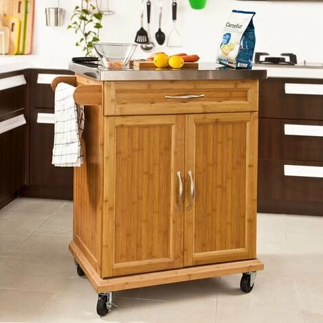 - With stainless steel worktop,1 drawer, 1 big cabinet in 2 floors,1 towel holder and 4 wheels, 2 with brakes.