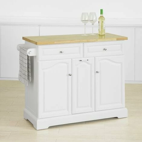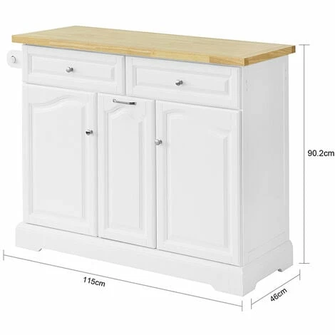 This modern extraordinary kitchen trolley is designed for various storage space and durable usage. It has two drawers, two cupboards with internal adjustable shelf, one pull-out bottle rack cabinet and one towel rail, providing ample storage space for you. The towel rail can be mounted on either the right side or the left side. The worktop is made of pine wood and rubber wood. The rest is made of MDF and particle board. With 4 casters, you can move the trolley around your kitchen easily. With this trolley, your home would be more stylish and spacious. Product Details Material: Rubber wood, pine wood, MDF, particle board. Dimensions: W115 x D46 x H90cm. Worktop size: 107 x 46cm. Weight: 51kg. Load capacity: 50kg. Item comes in 2 flat packs and requires self-assembly. Detailed instructions supplied. We are sorry we can not guarantee both packs are delivered at the same time. Please start to assemble after both packs are delivered. The decorative elements are not included in the delivery.