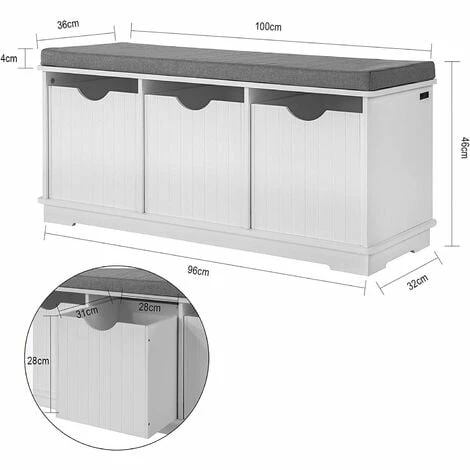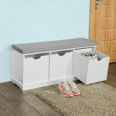 | The padded seat which is removable is ideal for comfortable sitting while putting on and taking off shoes. | 3 drawers provides ample storage space for shoes, boxes, books, magazines, etc. | These drawers can be pulled out completely as a great storage solution. | Modern design 3 drawers bench with soft seat cushion, good choice for hallway and living room. |
