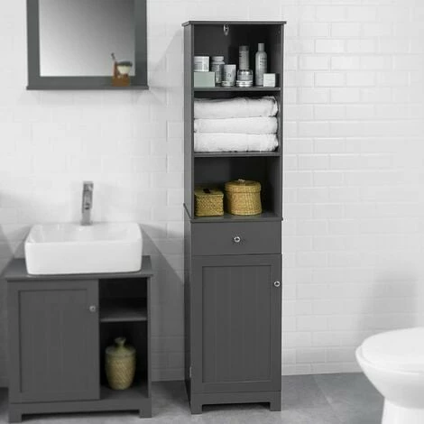 It has 3 shelves, 1 drawer and 1 cabinet with internal adjustable shelf to ensure ample storage for all your bathroom essentials.