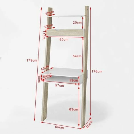 | Large desk area so you can have more than enough room for your computer or reading material. | Trendy ladder style for this shelving unit with 4 floors. 1 shelf on top and 1 drawer for storing and display. | For safety reasons, this shelf is attached to the wall using nails. | Delicate design adds beauty to your house. It is in line with various home style. |